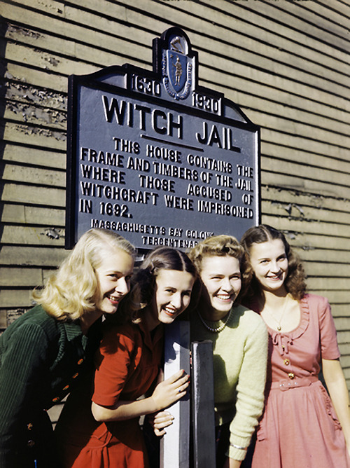 Girls pose by a jail that recalls the witch trials of 1692 in Salem, Massachusetts. Photo taken in 1945.
