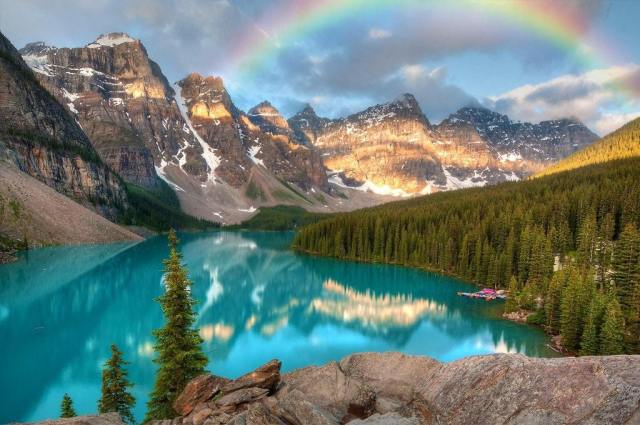 I couldn’t believe the rainbow. There was an audible gasp from everyone standing on this rock when it appeared. Moraine Lake – Banff, Alberta.