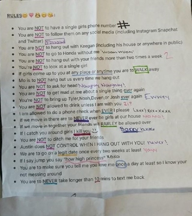 Young gents (and wlw and nb folks interested in ladies), if your girlfriend or prospective girlfriend presents you a list like this (especially in writing), you crumple that shit up, drop it at her feet, remind her that you are not property, and walk away.